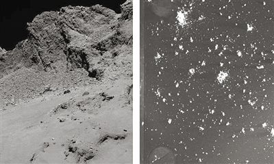 左圖 彗星67P的表面。右圖 利用COSIMA質(zhì)譜儀捕捉和檢查塵埃顆粒。圖片來(lái)源:歐空局官網(wǎng)