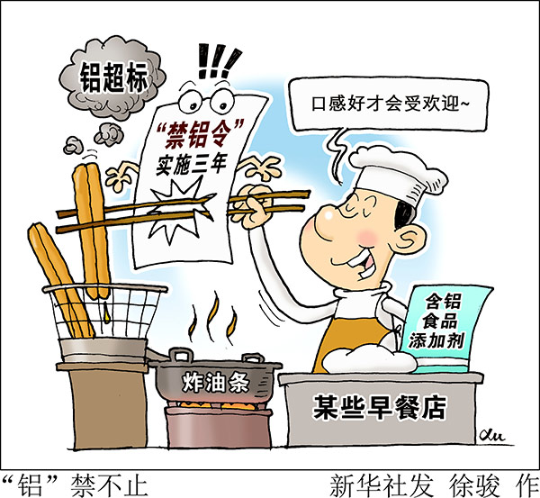 ?。玻埃保茨?,國家衛(wèi)計委、質(zhì)檢總局等五部門發(fā)布的《食品安全國家標準食品添加劑使用標準》對食品中鋁含量作出了明確界定:允許油炸面制品(包括油條)中使用明礬,但在最終制成的油炸面制品中,鋁的殘留量(干樣品)不應超過100毫克/千克。